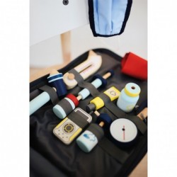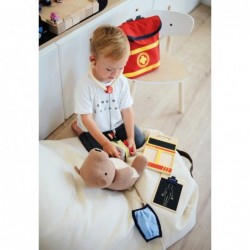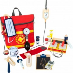 Kõik-ühes seade hädaolukordadeks! Selle realistliku, reguleeritavate rihmadega hädasignaalivärvides päästekomplekti abil on kõigil noortel, pürgivatel esmaabi andjatel käepärast palju "päris" meditsiinitööstuse tööriistu ja riistu. Kahekordne tõmblukk ja elastsed vahetükid seljakotis tagavad korra ja kiire ligipääsu robustsest puidust valmistatud hädaabivarustusele! Selle kiirabiarsti mängukomplekti absokonttsed tipphetked on pumbapalliga vererõhumõõtur, tõelise suurendusklaasiga otoskoop ja kriiditahvliga mängudefibrillaator! See on uuenduslik terviklik valvearsti mängukomplekt, mis koondab ühte mugavasse seljakotti kõik, mida lapsed arsti-patsiendi rollimänguks vajavad! Komplekti kuuluvad termomeeter, laste riidemask, lõikelaud, mänguasjasüstla sisestusavaga hädaabiampullid, pumbamehhanismiga desinfitseerimissprei, IV kott, konks-silmustükkidega plaaster, keeratava kaanega tabletikonteiner, allavajutava mehhanismiga mängusüstal, salvtoru, stetoskoop, toyskaloskoop, tüütseer. Nende tugevate ja meeldivate puidust meditsiiniliste mänguasjadega saavad lapsed rollimängudes uurida ja harjutada asju, mida tavaliselt tehakse arstivisiidi ajal. Nõudel olevad illustratsioonid annavad vihjeid selle kohta, milleks neid mängu ajal kasutada saab. Ideaalne, kui olete liikvel!
