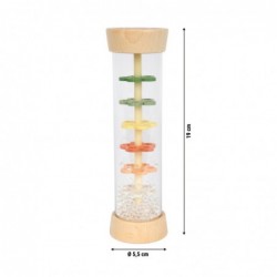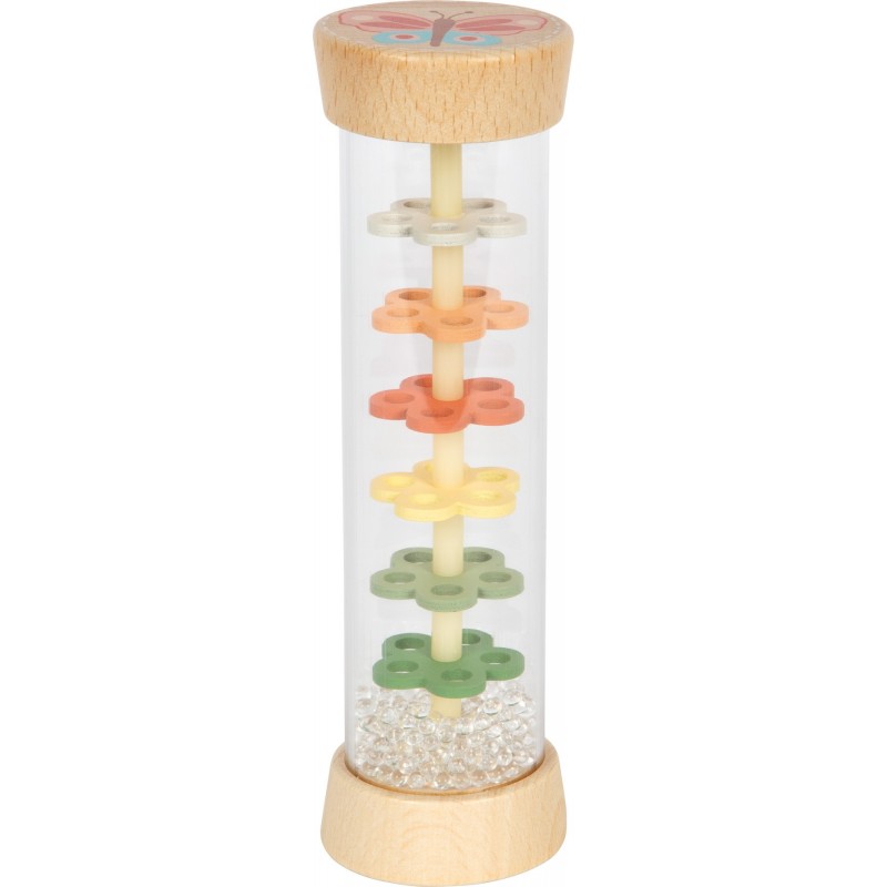 Vihma hääl kevadel! See vihmategija ühendab õrnad helid armastusega viimistletud disainiga, muutes selle noortele avastajatele meeleliseks kogemuseks. Olgu siis rahustava heliga mänguasjaks, esimeseks rütmipilliks või värviliseks kõristiks: läbipaistev plastpirn toob esile sädelevad helmed, mis nirisevad läbi lillekujuliste värviliste perforeeritud taldrikute. Põnev mäng silmadele ja kõrvadele, mis rõõmustab nii beebisid kui ka väikelapsi! Little Friends vihmategija toob vihmapiiskade võlu otse lastetuppa – visuaalselt ja akustiliselt! Vihmapulga sees olevad väikesed helmed tekitavad mõnusa õrna patsutava heli, mis meenutab sadavat vihma, kui need nirisevad läbi kuue värvilise lillekujulise augulise plaadi. Samas on vihmategija tõeline universaal: helimänguasjana, kõristina, rütmipillina või rahustava sensoorse mänguna saadab see beebisid ja väikelapsi väga erinevatel mänguhetkedel. Tänu läbipaistvale torule paelub lapsi sädelevate helmeste mäng – see treenib konkreetselt nende visuaalset taju. Helmeste ühtlane nirisemine mõjub rahustavalt, soodustab kuuldust arusaamist ning kutsub lapsi lõõgastuma, kuulama ja matkima. Sobib ka kõige väiksematele rullimiseks ja põristamiseks!