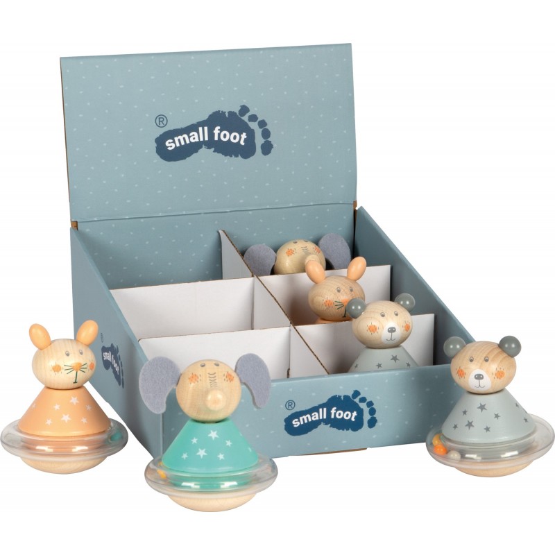 Komplektis 6. Tõuse püsti, karu! Kui neid armsaid puidust mänguasju lükata, õõtsuvad need edasi-tagasi, samal ajal kui värvilised väikesed helmed ümbritsevas plastikrõngas teevad põnevaid hääli. Plastist rõngas on pööratav ja pakub põnevaid mänguvõimalusi, täpselt nagu siis, kui pea oleks kinnitatud kummipaela külge. Karu, jänes ja elevant jätavad suurepärase mulje ka kõristi ja haarava mänguasjana! See erakordne beebimänguasi on ideaalne impulssostutoode ja tagab kauakestva mängulusti. Nende ümber ei hakka niipea igav!
