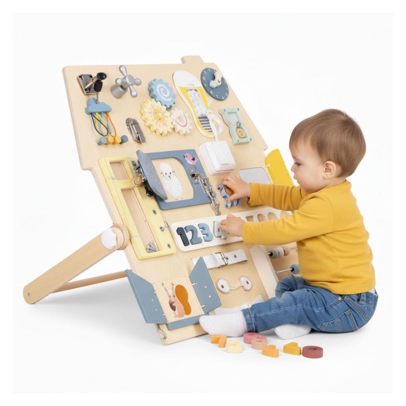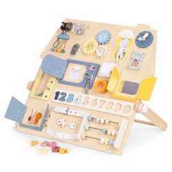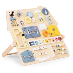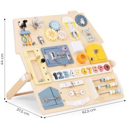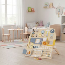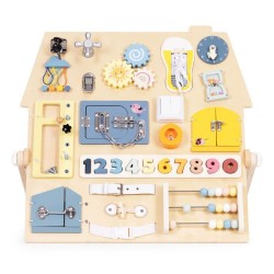 See puidust majakujuline tegevuslaud on stabiilne ja eraldiseisev konstruktsioon, mis on mõeldud lastele vanuses 3+. See sisaldab mitmesuguseid hariduslikke elemente, nagu värvilised numbrid, arvelaud, kell, hammasrattad, paeltega king, kraan, pandlaga vöö ja kruvidega hoiuruum. Laud arendab peenmotoorikat, käe-silma koordinatsiooni ja loogilist mõtlemist. Liikuvad elemendid võimaldavad lastel uurida põhjuse ja tagajärje põhimõtteid ning edendada iseseisvust. Ohutu konstruktsioon puidust, metallist, plastist ja kangast tagab vastupidavuse ja mugavuse.