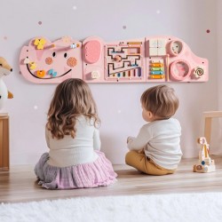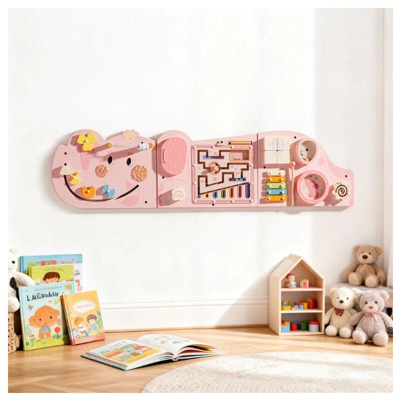 Roosa elevandikujuline seinale kinnitatav tegevustahvel – See mitmekülgne tegelustahvel pakub mitmesuguseid lõbusaid tegevusi, sealhulgas pöörlev helmeslabürint, sobivad klotsid, vormitud hammasrattad, magnetiline helmeslabürint, viietooniline ksülofon ja palju muud. Iga tegevus on loodud stimuleerima lapse arengu erinevat aspekti, muutes selle ideaalseks õppevahendiks igale mängualale.