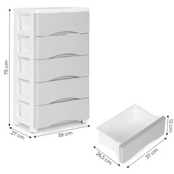 Sobib ideaalselt lastetuppa või vannituppa kosmeetika hoidmiseks. Vastupidavast plastikust valmistatud riiulil on stabiilne struktuur viie sahtliga, mis on varustatud mugavate käepidemete ja lukkudega, et vältida nende väljakukkumist. Ratastega jalad muudavad riiuli liigutamise lihtsaks ka täislastis.