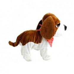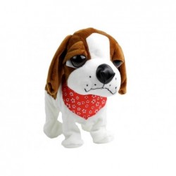 Pruunvalge rihma otsas koer on valmistatud pehmest ja mittetoksilisest, 100% keskkonnasõbralikust materjalist, mis on väga meeldiv puudutada. Loomal on suured, tumedad silmad, väljaulatuv saba ja suur nina, mis kergelt läigib. See on kaunistatud punase taskurätikuga, mis annab talle võlu.