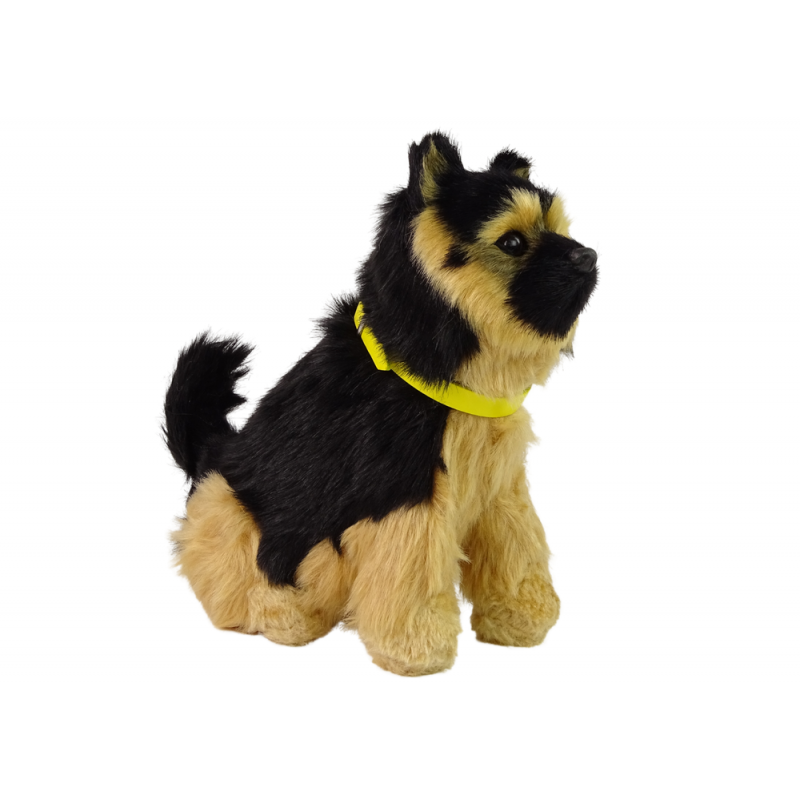 Interaktiivne plüüsi koer Pehme karvaga saksa lambakoer Silita pead ja õpi selle funktsioone tundma! Kui teie laps unistab oma koerast – tema eest hoolitseb, silitab, kaisutab ja soovib endale sõpra – siis see interaktiivne koer on suurepärane mängukaaslane! Aitame selle unistuse ellu viia. See aktiveerub, kui silitad ta pead: hakkab haukuma, liigutades pead ja saba. Iga kontaktiga koer reageerib. Teie väike laps tunneb end nii, nagu oleks tal tõeline lemmikloom. Mänguasi ei too tema näole mitte ainult naeratust, vaid muudab ka tema vaba aja lõbusaks. See on algus oma lemmiklooma pidamisele ja looma eest vastutuse õppimisele läbi mängu ja kohusetundlikkuse kodutööde tegemisel. See tasub end tulevikus ära. Ja kes teab, võib-olla teenib see, kuidas väikelaps väikese koera eest hoolitseb, talle tõelise. Koera pruun ja must karv on äärmiselt pehme ja meeldiv puudutada. Silmade värv on tume pruuni äärisega. Kaela ümber olev kollane eemaldatav krae lisab talle võlu. Koera mõõdud: 19 cm x 17 cm x 13 cm Mängukoer on pakendatud läbipaistvasse fooliumisse. See sobib kõigile lastele vanuses 3 aastat ja vanemad. Koer on CE sertifikaadiga, mis kinnitab selle vastavust Euroopa Liidu direktiivide nõuetele. Vastab EN71 standardile. See on väga ohutu mänguasi, millel pole teravaid osi ja mis on puudutamisel meeldiv. Koeraga mängimiseks on vaja 3 1,5V "AA" patareid. Aku sissepääs asub all, karusnaha all.