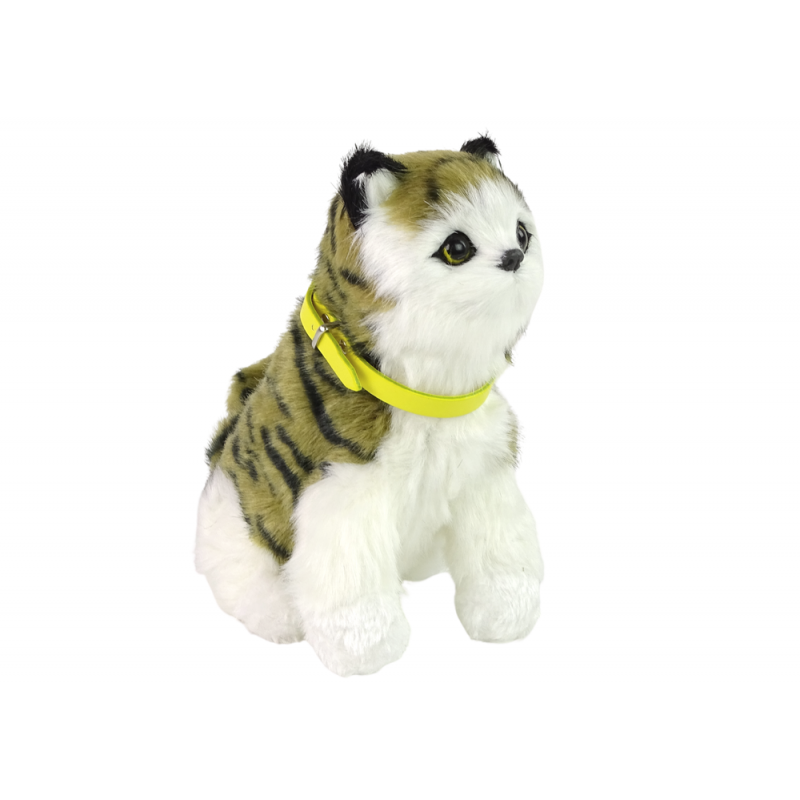 Interaktiivne Plush Kitty Pehme karusnahk Silita pead ja õpi selle funktsioone tundma! Kui teie laps unistab oma kassipojast - tema eest hoolitsemine, silitamine, looma kaisus ja ta soovib omale sõpra, siis interaktiivne kassipoeg on suurepärane mängukaaslane! Aitame selle unistuse ellu viia. See aktiveerub, kui silitate tema pead: hakkab niitma, liigutama pead ja saba. Kassipoeg vastab igale kontaktile. Teie väike laps tunneb end nii, nagu oleks tal tõeline lemmikloom. Mänguasi ei too tema näole mitte ainult naeratust, vaid muudab ka tema vaba aja lõbusaks. See on algus oma lemmiklooma pidamisele ja looma eest vastutuse õppimisele läbi mängu ja kohusetundlikkuse kodutööde tegemisel. See tasub end tulevikus ära. Ja kes teab, võib-olla teenib see, kuidas väikelaps väikese kassi eest hoolitseb, talle tõelise kassi. Kiisu valge ja pruun mustade triipudega karv on äärmiselt pehme ja meeldiv puudutada. Silmade värv on tume kollase äärisega. Kaela ümber olev kollane eemaldatav krae lisab talle võlu. Kassi mõõdud: 19 cm x 17 cm x 13 cm Mängukiisu on pakendatud läbipaistvasse fooliumisse. See sobib kõigile lastele vanuses 3 aastat ja vanemad. Koer on CE sertifikaadiga, mis kinnitab selle vastavust Euroopa Liidu direktiivide nõuetele. Vastab EN71 standardile. See on väga ohutu mänguasi, millel pole teravaid osi ja mis on puudutamisel meeldiv. Kassiga mängimiseks on vaja 3 1,5V "AA" patareid. Aku sissepääs asub karusnaha all.