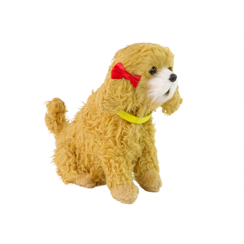 Interaktiivne Palus Koer Pehme karvatõug Puudel Silita pead ja õpi selle funktsioone tundma! Kui teie laps unistab oma kutsikast – tema eest hoolitseb, silitab, kaisutab ja soovib endale sõpra, on see interaktiivne kutsikas suurepärane mängukaaslane! Aitame selle unistuse ellu viia. See aktiveerub, kui silitad ta pead: hakkab haukuma, nuusutama, pead ja saba liigutama. Iga kontaktiga koer reageerib. Teie väike laps tunneb end nii, nagu oleks tal tõeline lemmikloom. Mänguasi ei too tema näole mitte ainult naeratust, vaid muudab ka tema vaba aja lõbusaks. See on algus oma lemmiklooma pidamisele ja looma eest vastutuse õppimisele läbi mängu ja kohusetundlikkuse kodutööde tegemisel. See tasub end tulevikus ära. Ja kes teab, võib-olla teenib see, kuidas väikelaps väikese koera eest hoolitseb, talle tõelise. Koera pruun karv on äärmiselt pehme ja meeldiv puudutada. Silmade värv tume pruuni äärisega. Kollane eemaldatav kaelarihm kaela ümber ja punased kummardused kõrvadel lisavad tema võlu. Koera mõõdud : 19 cm x 17 cm x 13 cm Mängukoer on pakendatud läbipaistvasse fooliumisse. See sobib kõigile lastele vanuses 3 aastat ja vanemad. Koer on CE sertifikaadiga, mis kinnitab selle vastavust Euroopa Liidu direktiivide nõuetele. Vastab EN71 standardile. See on väga ohutu mänguasi, millel pole teravaid osi ja mis on puudutamisel meeldiv. Koeraga mängimiseks on vaja 3 1,5V "AA" patareid. Aku sissepääs asub karusnaha all.