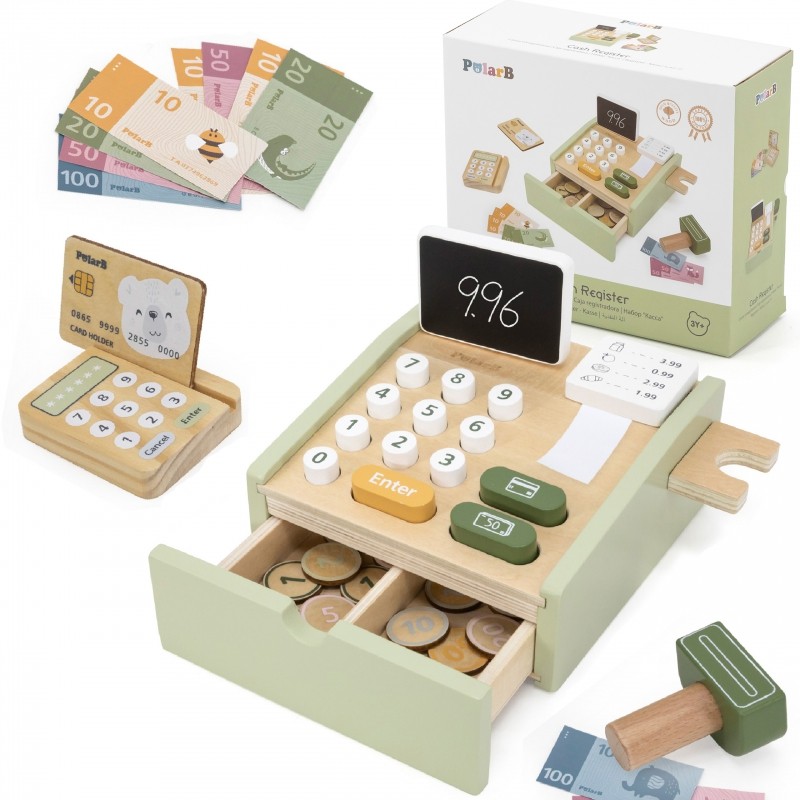 See kassa on suurepärane puidust mänguasi, mis võimaldab teil läbi mängida paljusid stseene, mis võivad poes aset leida. Lapsed saavad võtta kassapidaja või kliendi rolle ning koos harjutada sotsiaalset suhtlust ja suhtlemisoskusi. Sularaha või kaart? Loendage summa, võtke raha vastu ja andke õige vahetusraha. Kassa sisaldab rahatähti, münte ja maksekaarti. Lapsed saavad õppida lõbutsedes! Teaduste kuninganna – matemaatika ei ole enam hirmutav.