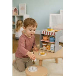 ECOTOYS kohvimasin on 2-ühes puidust mänguasi, mis ühendab kohvimasina funktsioonid võluva riiulitega poega. Sobib lastele vanuses 3 aastat ja vanemad ning on valmistatud ohutust ja vastupidavast puidust ilma teravate servadeta. Komplekt sisaldab 26 osa, sealhulgas tasse, alustasse, suhkrukuubikuid, portafiltrit, kohvikapsleid, maiustusi ja kohvitarvikuid. Nupud, mis keeramisel häält teevad, lisavad realismi ja mängurõõmu. Stiilne retrohõnguline varikatus ja pastelsed värvid täiendavad ideaalselt lapse köögi või kohviku atmosfääri. See on suurepärane viis kujutlusvõime arendamiseks, organiseerimis- ja suhtlemisoskuste õppimiseks ning motoorse koordinatsiooni harjutamiseks. See mänguasi sobib ideaalselt koduseks kasutamiseks, lasteaias või mängutoas.