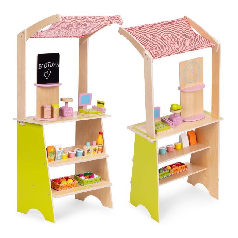 ECOTOYS puidust turulett on loominguline ja hariv mänguasi lastele vanuses 3+ aastat. See arendab kujutlusvõimet, sotsiaalseid oskusi ja iseseisvust mängulise poeskäimise kaudu. See on valmistatud vastupidavast ja ohutult värvitud puidust ning sisaldab 20 osa, sealhulgas kassaaparaati terminali ja kaaluga, mis lisavad realistliku tunde. Komplekt sisaldab värvilisi köögivilju, puuvilju ja toiduaineid, nagu mahlad, moosid, piim ja vürtsid – ideaalne nimede ja värvide õppimiseks. Kell ja kriiditahvlid lisavad funktsionaalsust. See sobib ideaalselt koduseks, eelkooli ja mängutoa kasutamiseks, soodustades rollimänge ja ühist mängu.