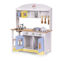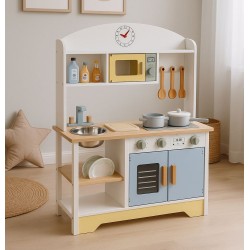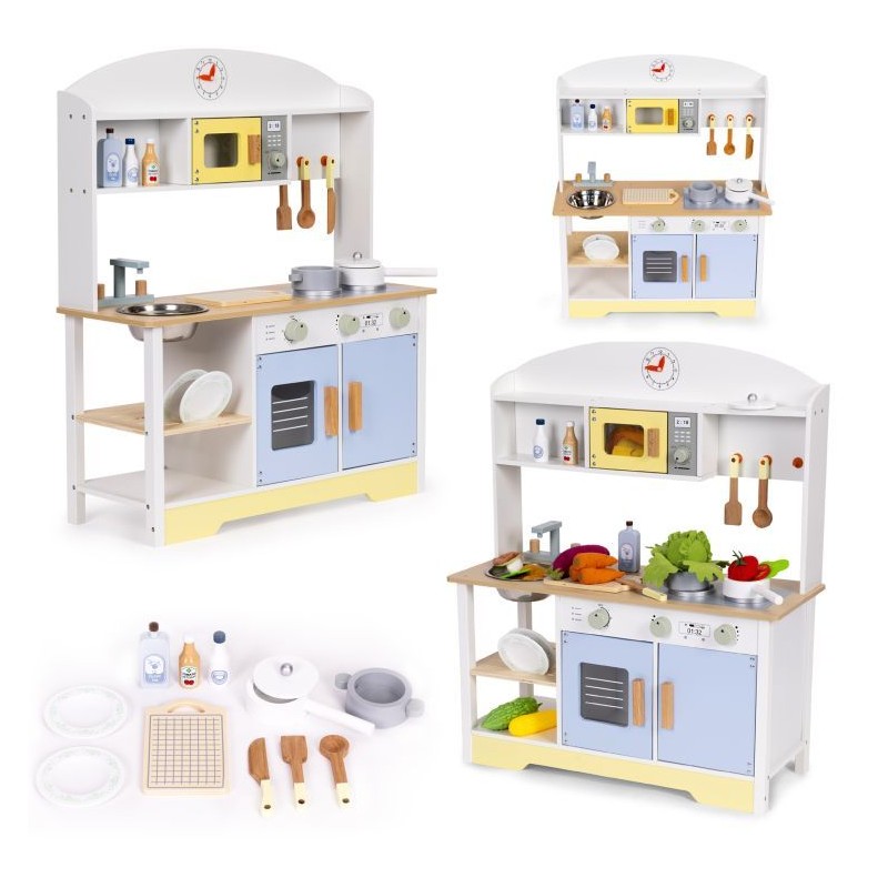 See ECOTOYS köök on täielik komplekt loominguliseks mänguks lastele vanuses 3+. See on valmistatud vastupidavast MDF-plaadist, millel on stabiilne konstruktsioon, mis tagab ohutu kasutamise. Köök on varustatud funktsionaalsete elementidega nagu ahi, mikrolaineahi, valamu, pesumasin ja kaks põletit klõpsatavate nuppudega. Kõik uksed ja kapid avanevad, võimaldades mugavat tarvikute hoiustamist. Liikuvate osutitega kell õpetab lastele planeerimist ja ajaplaneerimist, samas kui tööpind ja valamu toetavad kujutlusvõime ja käeliste oskuste arengut. Komplekt sisaldab 12 puidust tarvikut: 2 taldrikut, nuga, lusikas, spaatel, kaanega pott, kastrul, lõikelaud ning oliiviõli, piima ja ketšupi imitatsioon. Kogu köök on hoolikalt viimistletud, mistõttu on see suurepärane lisa nii lastetuppa kui ka mängutuppa