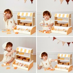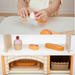 See võluv VIGA puidust minipagariäri on ideaalne rollimänguasi! Komplekt sisaldab realistlikku triibulise katusega letti/letti ja 16 puidust aksessuaari, mis imiteerivad maitsvaid küpsetisi. Lapsed saavad kehastuda päris pagariks või müüjaks, serveerides klientidele croissante, sõõrikuid, röstsaia, muffineid ja palju muid maiustusi. Letil on kaks riiulit, spetsiaalne koht leiva jaoks (imiteerib telliskiviahju) ja serveerimistangid, mis lisavad mängule autentset hõngu. Peened pastelsed värvid (naturaalne puit, valge ja oranži/kollase varjundid) muudavad pagariäri ilusaks täienduseks iga lapse tuppa. Pagariäri mängimine on suurepärane loovuse ja sotsiaalsete oskuste arendamiseks läbi interaktsiooni ning motoorsete oskuste toetamiseks väikeste elementide ja tangide manipuleerimise kaudu. Kvaliteetne ja vastupidav puitkonstruktsioon garanteerib tundideks turvalist ja kaasahaaravat mängu. Andke oma lapsele võimalus juhtida oma väikeettevõtet VIGA abil!
