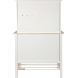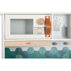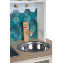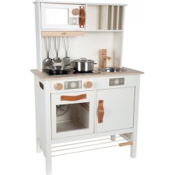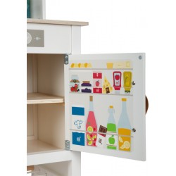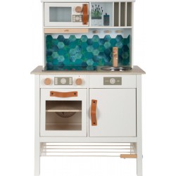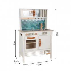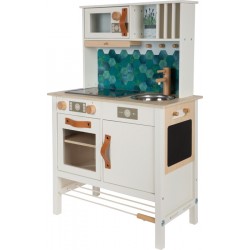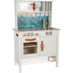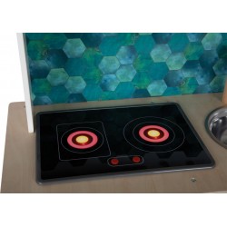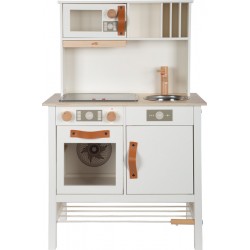 Tõeline pilgupüüdja ​​lastetoas! See vastupidavalt ehitatud mänguköök jätab kauni mulje moodsa sooja valge värvilahendusega koos stiilsete konjakivärvi kunstnahast käepidemetega. Välimust täiustavad veelgi sellised aktsendid nagu pööratavad tagaseinad (põhi-/plaadimustriga) ning illustratsioonidega külmkapi ja ahju pinnad. Tööpinna, pöörlevate klõpsatavate nuppude, valguse ja heliga elektripliidiplaadi, metallist kraanikausi ja eemaldatava ahjuplaadiga ahjuga, mida saab kasutada ka kriiditahvlina, pakub see köök realistlikku mänguaega. Tänu sissetõmmatavale õhupuhastile ja kaasasolevatele köögitarvikutele, mis koosnevad potist, pannist ja kolmest köögiriistast, on köök mänguvalmis. Vajalikud on 2x AA patareid (ei kuulu komplekti).