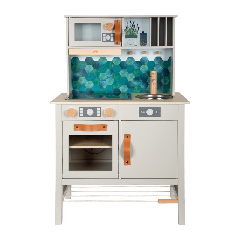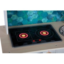 Tõeline pilgupüüdja ​​lastetoas! See vastupidavalt ehitatud mänguköök jätab kauni mulje moodsa sooja valge värvilahendusega koos stiilsete konjakivärvi kunstnahast käepidemetega. Välimust täiustavad veelgi sellised aktsendid nagu pööratavad tagaseinad (põhi-/plaadimustriga) ning illustratsioonidega külmkapi ja ahju pinnad. Tööpinna, pöörlevate klõpsatavate nuppude, valguse ja heliga elektripliidiplaadi, metallist kraanikausi ja eemaldatava ahjuplaadiga ahjuga, mida saab kasutada ka kriiditahvlina, pakub see köök realistlikku mänguaega. Tänu sissetõmmatavale õhupuhastile ja kaasasolevatele köögitarvikutele, mis koosnevad potist, pannist ja kolmest köögiriistast, on köök mänguvalmis. Vajalikud on 2x AA patareid (ei kuulu komplekti).