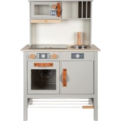 • Tugevalt ehitatud moodne mänguköök uhkes soojas hallis värvitoonis koos konjakikarva kunstnahast käepidemetega.
