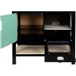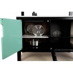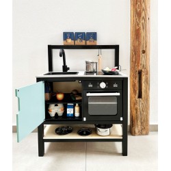 Eriti praktiline ja funktsionaalne: sellel mänguköögil on tööpinna all riiul ja konksud köögitarvikute riputamiseks, et kõik köögitarvikud saaksid pärast mängu korralikult organiseeritud ja käepärast olla. Üks nutikas detail on kapi alumine riiul, mida saab kasutada ka mänguköögi ahju grillrestina. Kapi vasakut külge saab paindlikult kasutada külmkapi või nõudepesumasinana. Kerge raamiga on puidust kööki ka lihtne liigutada, nii et mängukohta saab muuta. See on visuaalselt meeldiv ja moodne laste mänguköök, mis pakub kõike, mida noored tippkokad oma kujutlusvõime toitmiseks vajavad.