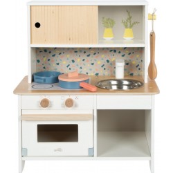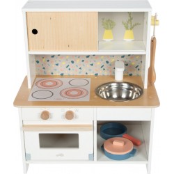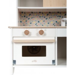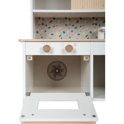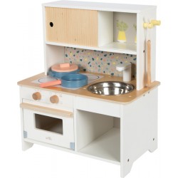 Kompaktne terrazzo-disainiga mänguköök ühendab ruumisäästliku disaini laiade mänguvõimalustega, mistõttu sobib see ideaalselt väikestesse korteritesse või teiseks köögiks vanaema ja vanaisa majas. See on hästi varustatud ja mänguvalmis. Lapsed õpivad koos mängides igapäevaseid köögitarbeid kasutama ja tugevdavad oma sotsiaalseid oskusi.