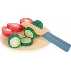 Selle kvaliteetsest puidust salatiteemalise moodsa mängukomplektiga saab mänguköögist fantaasiarikas kulinaarse rollimängu koht. Kompleksne lõikekomplekt koosneb elegantsest puidust salatikausist naturaalse värviga puidust kaanega, mida saab kasutada ka lõikelauana. Kurk ja kaks tomatit on kokku pandud takjapaelaga ja neid saab eraldada realistliku disainiga mänguköögiviljanoaga. Vildist valmistatud roheline salatipea eemaldatavate siselehtedega, mugav köögiviljariiv, mugavad salatitangid, kastme-/oliiviõlipudel, soolatoos ja isegi autentse disainiga köögiviljakoorija täiendavad seda lõikekomplekti.