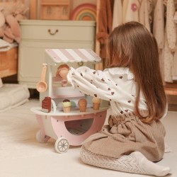 - Rikkalik tarvikute komplekt: sisaldab jäätisepulki, vahvleid, värvilisi kulpe, jäätisekulpi, menüüd ja puidust münte – kokku 27 osa