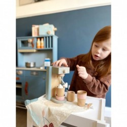 Laste mänguköögi noortele baristadele! Sellesse puidust valmistatud komplekti kuuluvad kaasaegne mängukohvimasin, kaks kohvipaksu ja kaasavõetavat tassi, kaane/lusikaga suhkrunõu ja tilga piimavahuga piimakann. Kohvipadjad pakuvad realistlikku mängulusti, kui need tassi kukuvad, et seejärel magnetilise piimavahuga stiilselt kaunistada! Ebaütlevad värvid, nagu hele suitsusinine, valge ja palju naturaalset puitu, muudavad selle köögikomplekti tõeliseks pilkupüüdjaks! See on komplekt värvidega, mis täiendavad Compact Play Kitchen "maitsvat" (12216)! Kohvimasinale saab laadida peal oleva kohvipadja, mis libiseb hoova aktiveerimisel läbi pilu alla tassi sisse. Kohvikaunade kooniline kuju tagab, et kaunad satuvad tassi alati parempoolne külg üleval. Magnetilise piimavahu saab piimakannuga üles võtta ja uuesti tassi täita. "Piimavahutoru" on varustatud juhtmega, mis on täielikult ümbritsetud riidega, paindub igas suunas ja mille otsas on magnet, mille külge saab kinnitada piimavahu. Tasakaalustatud disain ja kaasaegne värvilahendus sobivad eriti hästi kaasaegsesse lasteaia- ja elutoa miljöösse.