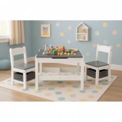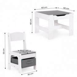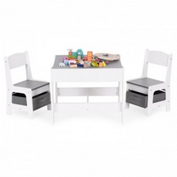 Komplekti kuulub 2 tooli ja laud. Komplektil on vastupidav ja stabiilne MDF konstruktsioon. Laud on varustatud kahepoolse eemaldatava kriiditahvliga plaadiga. Pealmise all on funktsionaalne ruum klotside, mänguasjade või muude väikeste esemete hoidmiseks. Toolide istme all on mahukad, tekstiilist sahtlid, mis sobivad suurepäraselt mänguasjade hoiustamiseks. Komplekt sobib suurepäraselt lastetuppa või mängu- ja ooteruumidesse.