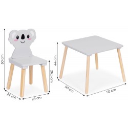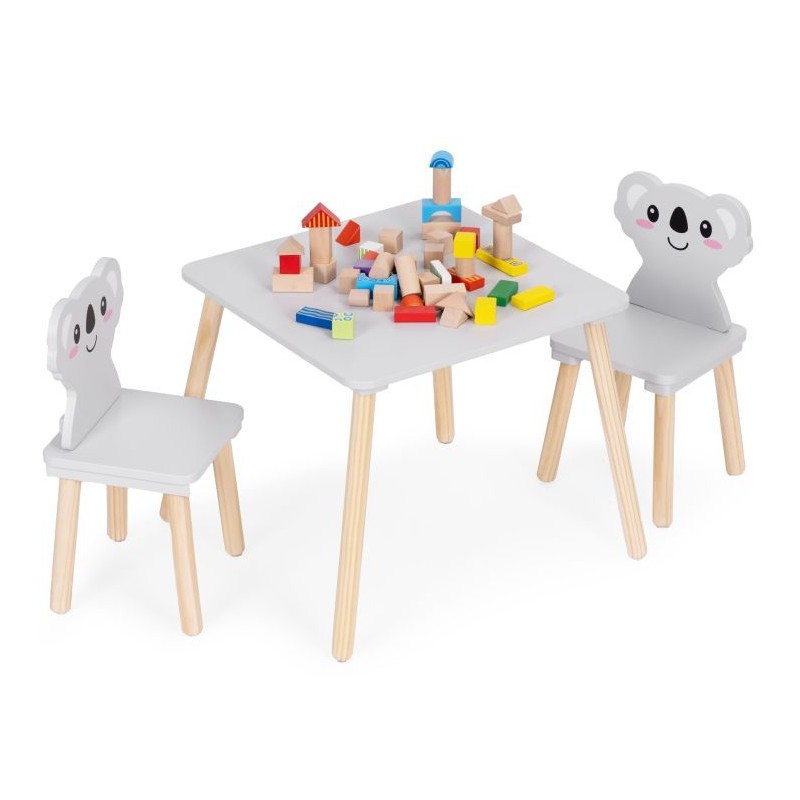 ECOTOYS lastemööblikomplekt sisaldab lauda ja kahte tooli ainulaadsete koaalakujuliste seljatugedega. See sobib ideaalselt mängimiseks, õppimiseks ja lõõgastumiseks nii kodus kui ka eelkooliealiste mängualadel. Tänu vastupidava puidu ja MDF-plaadi kasutamisele on kogu komplekt stabiilne ja vastupidav. Laual on lai pealispind, mis pakub piisavalt ruumi joonistamiseks, klotside virnastamiseks ja muudeks loomingulisteks tegevusteks. Ümarad servad suurendavad ohutust, kaitstes lapsi juhuslike löökide eest. Mööbli kõrgus on kohandatud noorima lapse pikkusele, mis mõjutab positiivselt mugavust ja õiget istumisasendit. Komplekti kuulub kaks mugavat ja ergonoomilist tooli, mille seljatoed meenutavad kaelkirjakut.