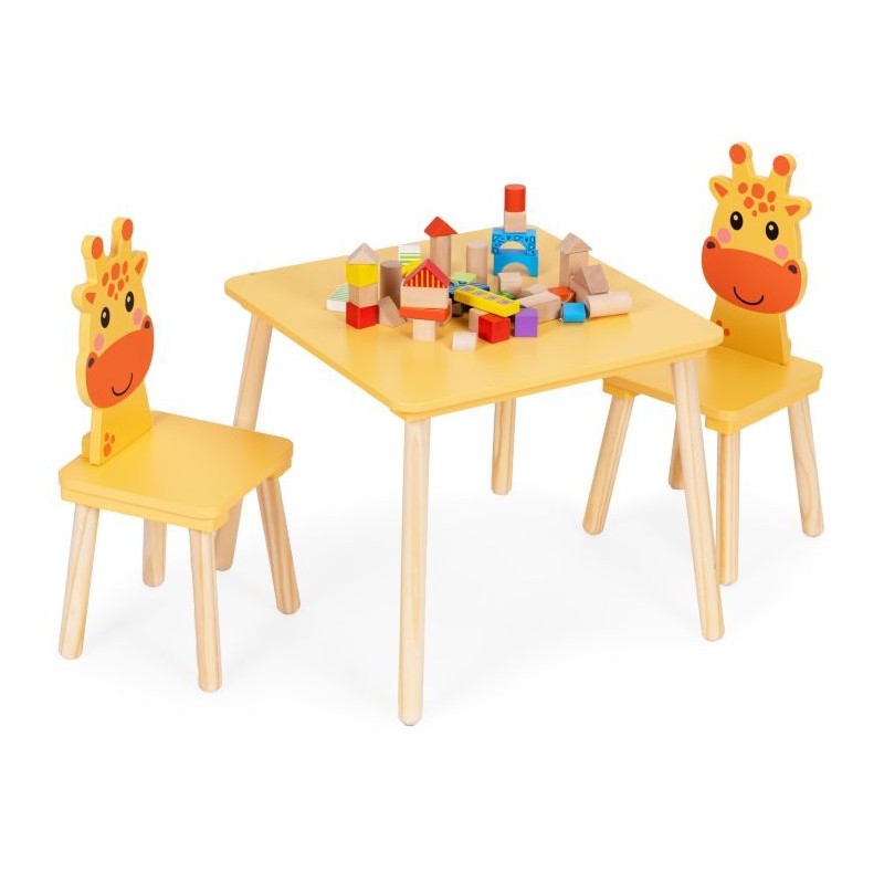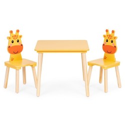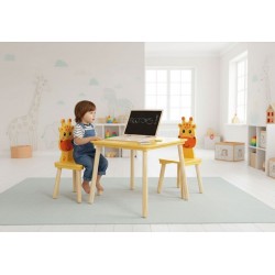 ECOTOYS lastemööblikomplekt sisaldab lauda ja kahte tooli ainulaadsete kaelkirjakukujuliste seljatugedega. See sobib ideaalselt mängimiseks, õppimiseks ja lõõgastumiseks nii kodus kui ka eelkooliealiste mängualadel. Tänu vastupidava puidu ja MDF-plaadi kasutamisele on kogu komplekt stabiilne ja vastupidav. Laual on lai pealispind, mis pakub piisavalt ruumi joonistamiseks, klotside virnastamiseks ja muudeks loomingulisteks tegevusteks. Ümarad servad suurendavad ohutust, kaitstes lapsi juhuslike löökide eest. Mööbli kõrgus on kohandatud noorima lapse pikkusele, mis mõjutab positiivselt mugavust ja õiget istumisasendit. Komplekti kuulub kaks mugavat ja ergonoomilist tooli kaelkirjakukujuliste seljatugedega.