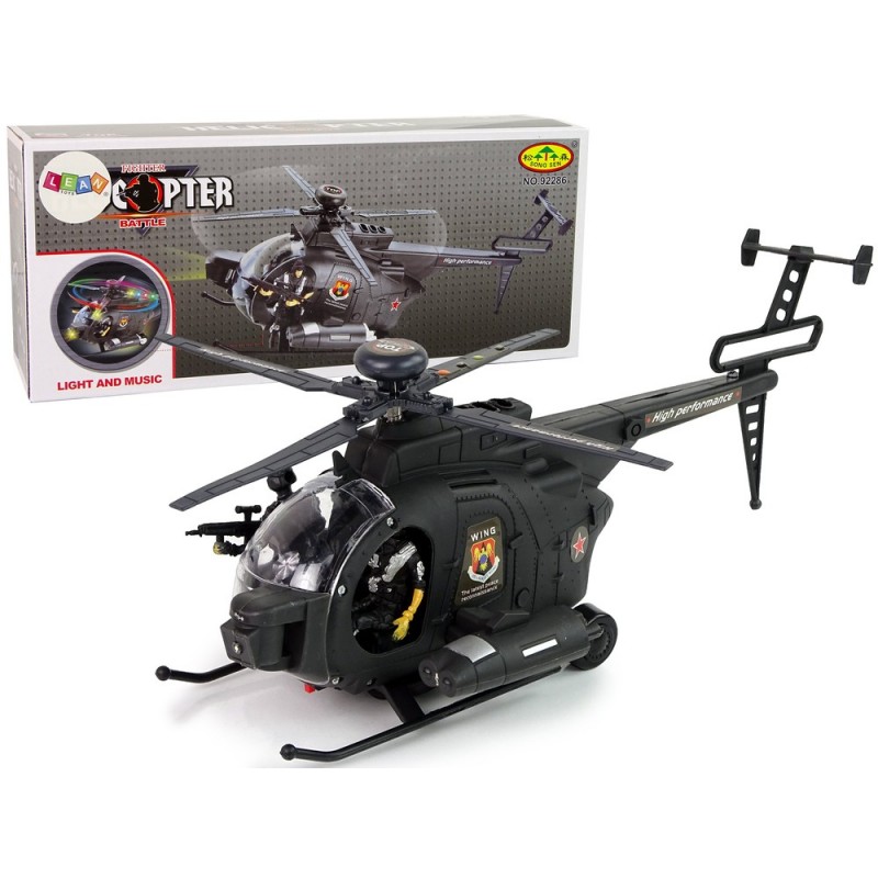 Sõjaväehelikopteri tiivad, tuled töötavad patareidega Sõjaväehelikopter võimaldab teil mõnusalt aega veeta, muuta mängimiseks vaheldust ning rahuldada sõjaväe- ja lennundusfänne. Teie laps tunneb end salajases sõjalises operatsioonis osalejana. Mäng arendab laste loogilist mõtlemist ja strateegiaoskusi, nad saavad mängida tohutu sõjaväehelikopteri piloodi rolli, aga ka teisi meeskonnaliikmeid. Helikopterit hoitakse mustades toonides, lai telik teeb maandumise lihtsaks. Laia vahega tiivad koos värviliste tulede ja taustahelidega muudavad lõbu realistlikuks. Kaks komandot, üks juhtpuldi juures, teine tulivalmis! Helikopteri alla on paigaldatud rattad, mis panevad kopteri liikuma. Kõik elemendid on tehtud väikseimatele detailidele tähelepanu pöörates, mis teeb mänguaja kindlasti igale poisile nauditavamaks. See on valmistatud sertifitseeritud tugevast plastikust. Tiibadel ja kogu kehal on kleebised. Helikopteri mõõdud: 35 cm x 12 cm x 16 cm Pakendi mõõdud: 35 cm x 15 cm x 10 cm Komplekt sobib üle 3-aastastele lastele. Toiteallikaks on kolm 1,5 V AA patareid, mis ei kuulu komplekti. Mänguasi on CE-sertifikaadiga ja vastab EN 71-le ning on pakendatud pappkarpi, mistõttu sobib see teie lapsele kingituseks.