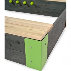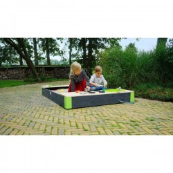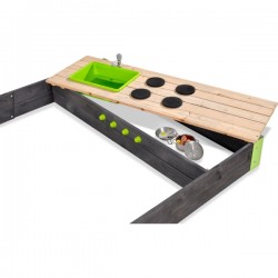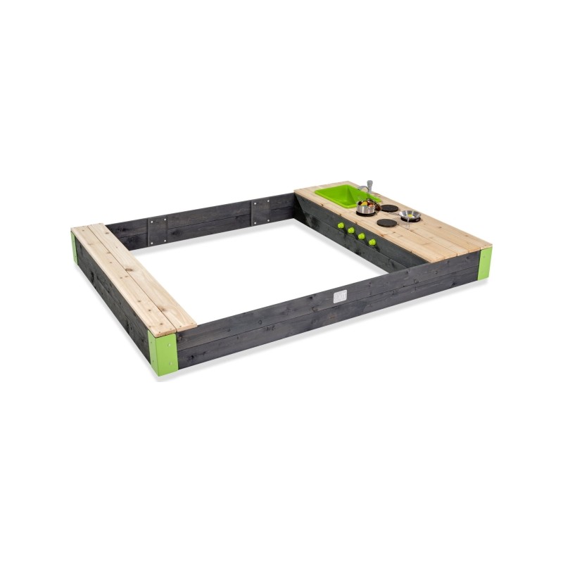 EXIT Aksent puidust liivakast on suur ristkülikukujuline liivakast. Liivakastis on pink, panipaik ja köök, lisaks luksuslikud köögitarvikud, mis tagavad lastele rohkelt lõbu ja mängu. Köögitasapinnal on pliit pööratavate nuppudega ja valamu koos toimiva kraaniga. Kraani saab aktiveerida vooliku kinnitamisega ja kuna valamu saab eemaldada, saab kraanivee sellest hõlpsalt eemaldada. Köögitasapinna all on suur panipaik, kuhu saab panna mänguasju, näiteks panne, kui lapsed on nendega mängimise lõpetanud. EXIT Toysi Aksent puidust liivakastid on kergesti kokkupandavad ja ülimalt vastupidavad. Eelnevalt puuritud augud on nurkades metallühendustega kinnitatud, mis muudab liivakasti väga stabiilseks. Nurgad on värvitud selgelt roheliseks ja see koos halli puiduga annab liivakastile kena ja moodsa ilme. EXIT Toysi Aksent liivakastid on valmistatud FSC®-sertifitseeritud seedripuust (FSC 100%, FSC® SCS-COC-007799). Seda tüüpi puit on kildudeta ja loomulikult vastupidav ilmastikutingimustele, näiteks vihmale, mis omakorda muudab selle ka mädanemiskindlaks. EXIT puidust liivakastidele ei ole vaja enne kasutamist mingit spetsiaalset töötlust rakendada, mis tähendab, et lapsed saavad neis kohe ohutult mängida.