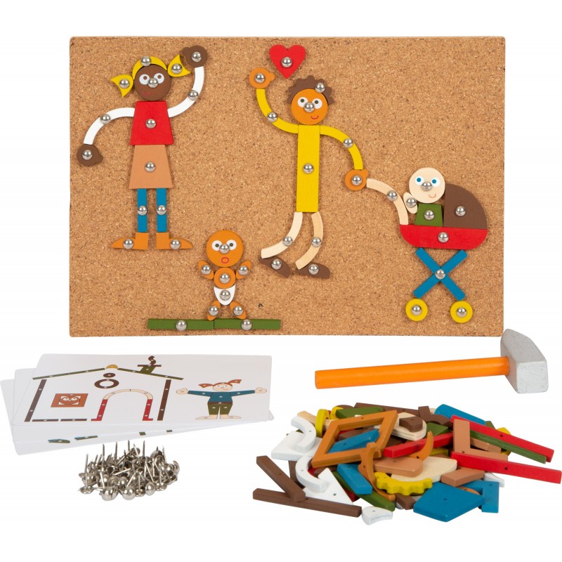Pereteemaline terviklik loomelavastus! Korgitahvli, puidust haamri, tihvtide ja paljude erinevate lamineeritud puidust puitelementidega saate selle haamrimänguga konta arvukalt pilte ja motiive perekonnas, nagu vanemad, õed-vennad, sõbrad või lemmikloomad. Kaasas 6 pildimalli ja hoiukarp! Klassikaline moodsates värvides haamrimäng, millega saate loovalt teha oma perekonnast või sõpruskonnast igasuguseid inimesi, kujutades samal ajal selliseid teemasid nagu emotsioonid või mitmekesisus. Selle mänguga on teil võimalus konta oma kunstiteoseid või järgida pildimalle. Oma piltide loomine soodustab loovuse arengut. Lapsed treenivad selle haamrimänguga ka oma käteosavust, õpivad paremini tundma värve ja kujundeid ning parandavad oma visuaalset taju. Ja veel üks eelis: haamrimängud sobivad erinevatele vanuserühmadele ja pakuvad kauakestvat lõbu.