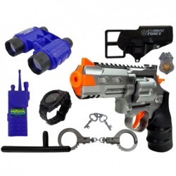 Politseikomplekt Relv Käerauad Binokkel Vilekella märk Kas otsite oma lapsele huvitavaid mänguasju? Meil on üks soovitus, mis tuleb kasuks kleidipeol, aga ka mänguajal. Lapsed armastavad ümbritsevat jälgida, mistõttu mängivad nad sageli erinevaid rolle, kehastades erinevaid tegelasi. Kui teie poeg unistab saada seadusekaitsjaks ja tunneb huvi politsei eriüksuste vastu, mida ta on filmides näinud, on meil midagi ideaalset! Sellise varustusega toob mudilane korra kõikjale. Noore mundrikandja komplekt koosneb neljast elemendist. Kõik need on valmistatud kvaliteetsest plastikust, mis garanteerib, et need teenivad teie last pikka aega. Relv on valmistatud hõbedast ja mustast. Püss teeb tulistamishäält, vajuta lihtsalt päästikule ja uuesti laadides. Ükski varas ei pääse! Teie lapse kujutlusvõime õitseb kindlasti. Täiendav eelis on pildistamise ajal valgusefekt. Lisaks on komplektis binokkel, käerauad ja nupp. Aksessuaarid võimaldavad aksessuaaride suure hulga tõttu mängida ka kahe lapsega. Minge politseisse ja tegutsege! Komplekti element: - revolver - kabuur - rinnamärk - vile - binoklid - käerauad - raadiosaatja - vile - käekell - tonfa nupp Komplekti valitud elementide mõõtmed: - revolver: 19 cm x 13 cm x 4 cm - binoklid: 10 cm x 9 cm x 4 cm - cmie x : cmie x cm : 14,5 cm x 5 cm x 2 cm Karbi mõõdud: 46,5 cm x 30 cm x 5 cm Püstol töötab kolme AG13 1,5 V patareiga (kaasas). Mänguasjad on mõeldud üle 3-aastastele lastele. Komplekt on CE sertifikaadiga ja vastab EN 71 standardile. Komplekt on pakendatud pappkarpi, mistõttu on see ideaalne kingitus.