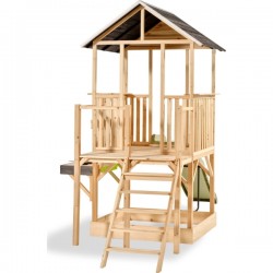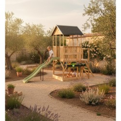 EXIT Panorama 550 puidust mängumaja liumäe, mudaköögi ja liivakastiga teeb oma nimele au: teie lapsed saavad nautida panoraamvaadet kogu aiale! See Panorama mängumaja on täiskomplekt veranda, lõbusa kõrge liumäe, puidust mudaköögi ja liivakastiga. Seal on piisavalt ruumi mitmele lapsele korraga mängimiseks. See on tingitud avatud disainist, mis teeb lastele maja kaasamise oma õuemängudesse lihtsaks. Mängumaja all on liivakast ja majja sisenemiseks kõnnivad lapsed trepist üles ja seejärel liuglevad uuesti alla. Puidust mudaköögis saavad nad valmistada oma maitsvaid roogasid. Kuna disain on nii ligipääsetav, tundub õuemängumaja turvaline ja mugav isegi kõige pisematele lastele. Ja te näete alati oma pisikesi. Nii saate lasta oma lastel nautida ruumi vabalt mängida ja koos muretult lõbutseda!