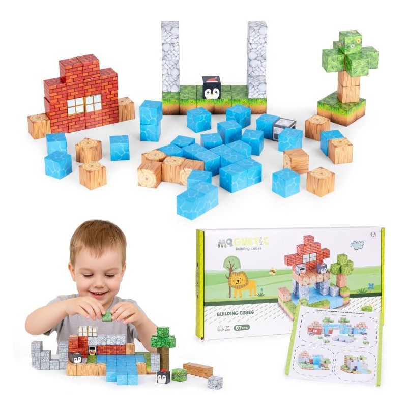 Komplekt sisaldab 87 magnetilist kuubikut mõõtmetega 2,5x2,5x2,5 cm, mis võimaldavad luua lõputult palju struktuure – lihtsatest tornidest keerukate kolmemõõtmeliste kujunditeni. Sisseehitatud magnetid muudavad tükkide ühendamise lihtsaks, pakkudes lastele kiiret ja rahuldust pakkuvat kogemust. See on ideaalne viis ruumilise kujutlusvõime, loogilise mõtlemise ja motoorse koordinatsiooni arendamiseks. Klotsid on mõeldud lastele vanuses 3 aastat ja vanemad. Komplekt sisaldab ka šabloone valmisstruktuuridega.