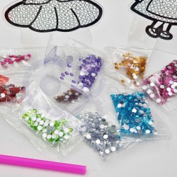 - 12 kleebist, igaüks 6-7 cm suurune, trükitud kujundusega. Kujundused on kaetud spetsiaalse liimikihiga, mis võimaldab teemante peale liimida,