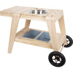 Vee ja liivaga möllata, süüa teha ja ehitada! See naturaalsest töötlemata täispuidust valmistatud kompaktne looduskeskne mänguköök sobib ideaalselt väikesesse aeda, terrassile või rõdule! Jõulise väliköögina mängitav igast küljest ja see jätab vaatamata oma kompaktsele suurusele palju ruumi loominguliseks mänguks. Kaasas eemaldatav porikauss, pöördnuppudega pliidiplaat, hulk pilusid ja kaks suurt plastikust prügikasti alumisel küljel, mis pakuvad ruumi liiva, muda ja liivamänguasjade hoidmiseks. Purunematute ratastega kaasasurumiseks ja pesaga veevooliku jaoks.