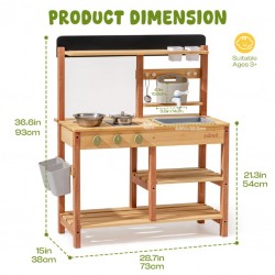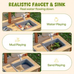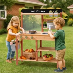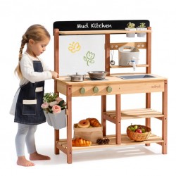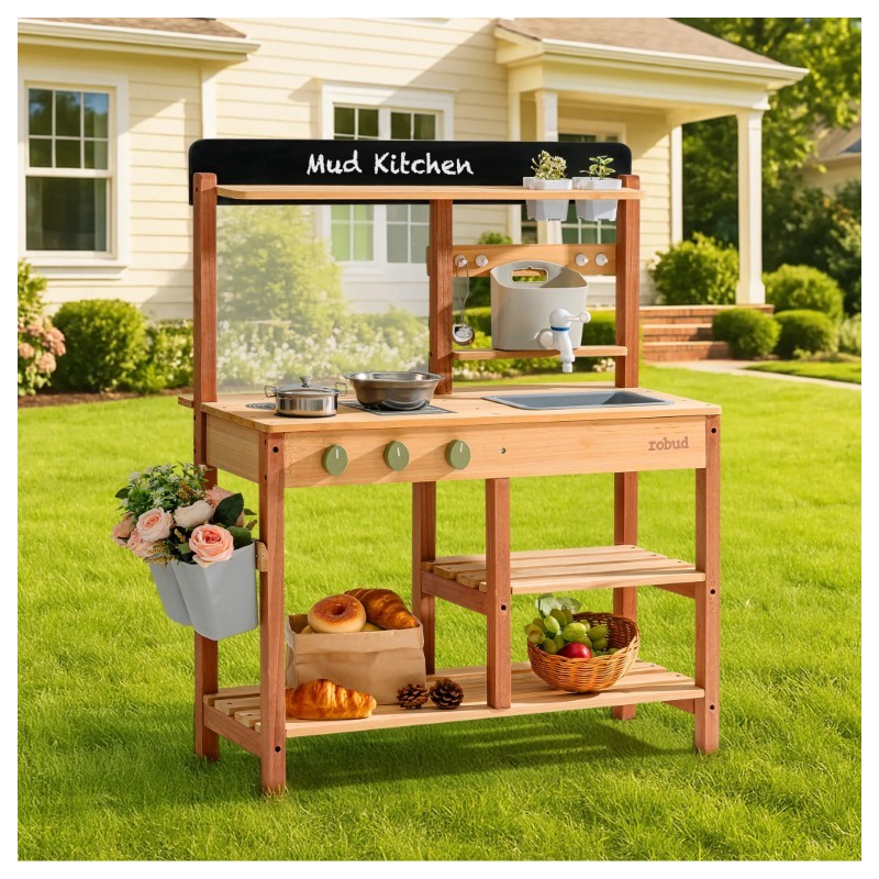 Õues mängimine ja õppimine: mudaköök on loodud väikelastele õues mängimiseks, kombineerides liiva, vett ja muda realistlike kokkamiskogemuste saamiseks. Ideaalne kujutlusvõimelise mängu ja praktiliste tegevuste arendamiseks looduses.