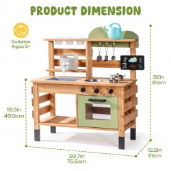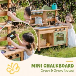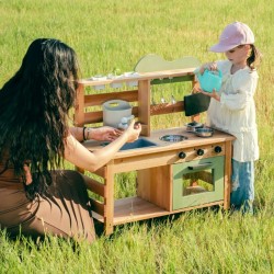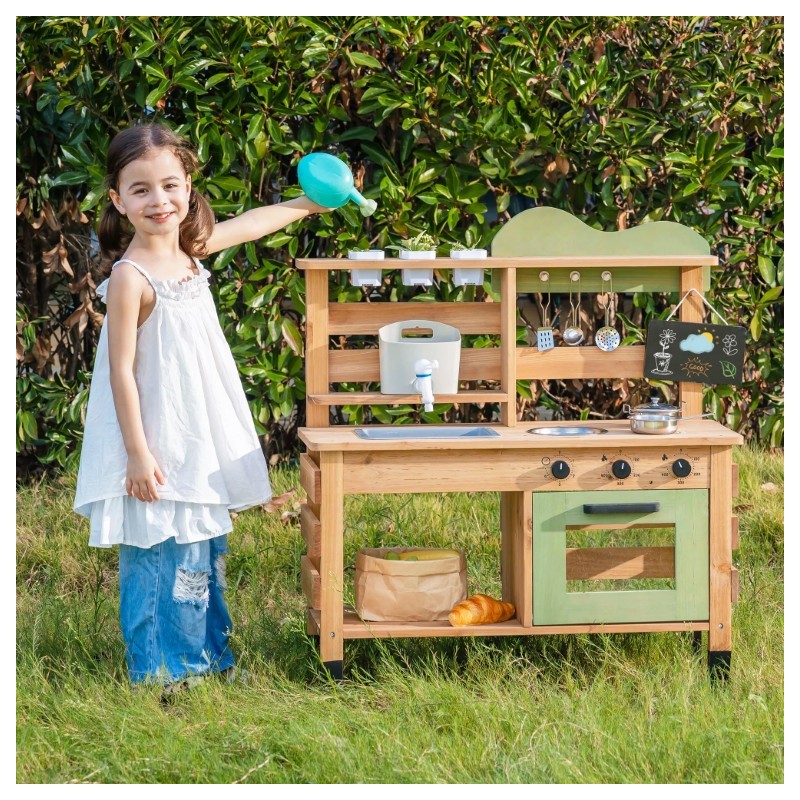 Loominguline mudaköögi kogemus lastele mõeldud õues asuv mudaköök on varustatud realistliku ahju, eemaldatava kraanikausiga, millel on kraaniga veepaak, võluva istutuskruusiga, erinevate köögiriistade ja organiseeritud hoiuruumiga. See uuenduslik disain soodustab sensoorset uurimist looduslike materjalide, näiteks muda ja liiva abil, säilitades samal ajal täiusliku organiseerituse.