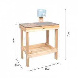Suurepärane mudamängu lõbu kompaktses formaadis! See mudaköök on valmistatud vastupidavast täispuidust, ilmastikukindlalt värvitud halli kontrastse töötasapinnaga, millel on pliidiplaat ja graveeritud "puutetundlik juhtimine", eemaldatav veejaotur veekraaniga, stabiilne plastkauss ja rohke hoiuruum tänu suurele hoiukastile. Mänguasjade hoiustamiseks mõeldud süvendid on plussiks korrasolekule. Ideaalne väikestesse aedadesse, terrassidele või rõdudele – ühtlasi vastupidav, stiilne ja funktsionaalne. Multifunktsionaalne mudajaam sobib suurepäraselt ka laste mängulauaks!