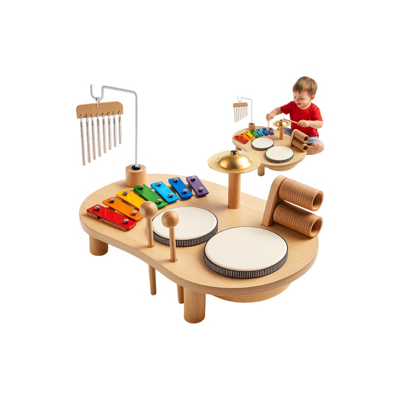 - Arendab muusikalisi ja rütmilisi võimeid – laps õpib taldrikute, trummide ja kõristite helisid, õppides rütmi ja muusikalist kuulmist; Montessori uuringud kinnitavad, et helidega mängimine toetab kõne ja keskendumisvõime arengut 40% kiiremini