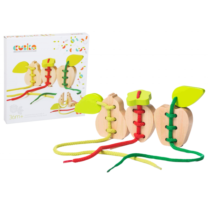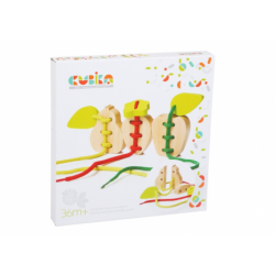 Puidust nöörist mänguasi Põimitud Puuvilja Pirn Õun Maasikas 14811 Orgaanilisest, naturaalsest puidust valmistatud kvaliteetne komplekt. Sobib suurepäraseks kingituseks nii poisile kui tüdrukule. Cubiki Apple Braid on hoolikalt valmistatud arendav mänguasi lastele. Põimimine on väga hea treening väikestele kätele, käe-silma koordinatsiooni ja peenmotoorika harjutamiseks. Keermestamine on suurepärane harjutus lapse käelise osavuse arendamiseks. Mänguasi arendab motoorseid oskusi, kannatlikkust ja kujutlusvõimet. Komplekt koosneb kolmest viljast, mille laps ühendab omavahel nööriga ehk 9 osast ja 3 värvilisest kingapaelast, millega saame üksikuid elemente ühendada. Mänguasjade tootmiseks valib tootja parimad puiduliigid ja kasutab mittetoksilisi veepõhiseid värve. Kõik CUBIKA mänguasjad on vastupidavad, kergesti puhastatavad ja teie lapsele ohutud. Toodetud Euroopas. Mänguasi sobib üle 3-aastastele lastele. Mõõdud: 2,5 cm x 18,5 cm x 18 cm