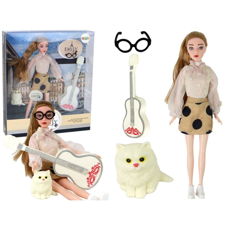 Lastenukk Emily kitarriprillidega Pika blondi karvaga kassipoeg Tutvustame Emily kitarriga nukku ja armsat valget kassisõpra, kes vajutades kostab kriuksuvaid hääli. Toode võimaldab lapsel arendada oma kujutlusvõimet, mängides komplekti kuuluvate toodetega. See võimaldab teil õppida loovalt lemmiklooma eest hoolitsemist ja luua õues loo kahest sõbrast. Emily nukk on pikkade, hobusesabaga blondide juustega imearmas mänguasi. Tal on rohelised silmad ja elegantne stiil: valge särk roosa kaarega, pruun mustade täppidega seelik ja valged spordijalatsid. Komplekti kuuluvad ka mustad prillid ja valge roosa kaunistusega kitarr. Kitarri mõõdud on 17 cm x 6 cm. Emily on ideaalne kaaslane väikestele muusika- ja moesõpradele. Komplekt ergutab loovust, arendab sotsiaalseid oskusi ja pakub lõputut lõbu ning võimaldab nautida lõputut melu. See ainulaadne komplekt võib olla suurepärane kingitus väikestele nukuhuvilistele. Kaasas olevad esemed: - Emily prillidega nukk- kitarr- kassipoeg Nuku mõõdud: 30cm x 7cm x 4cm Kassipoja mõõdud: 5cm x 4cm Pakendi suurus: 32cm x 28cm x 6cm Mänguasi on mõeldud üle 3-aastastele lastele ja on CE sertifikaadiga ja vastab ENF1 standardile.