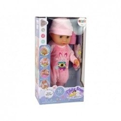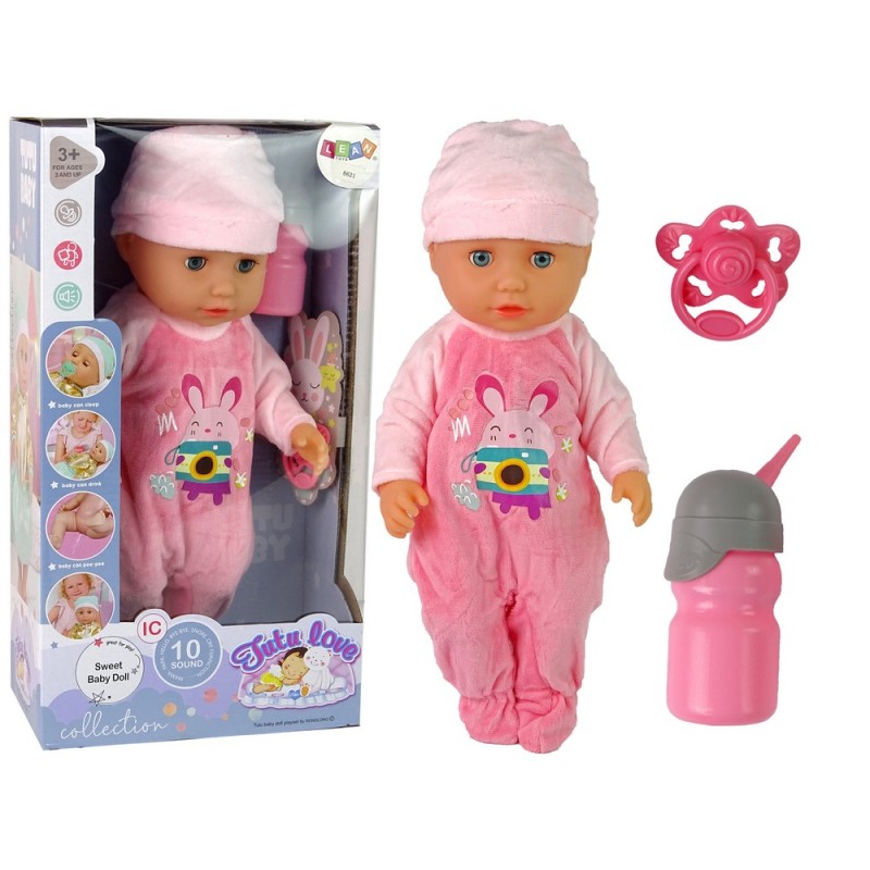 Baby Doll Pee Sounds Nukupudel Roosa pidžaama Armas beebinukk rõõmustab väikest. Mängimine on erakordne kogemus, mis õpetab vastutust ja empaatiat. Nuku hariv mõõde tasub end tulevikus ära ja aitab neil tunda teise inimese eest hoolitsemise olulist rolli. Teie lapsele meeldib jäljendada oma armastavat, hoolivat ja hoolitsevat emmet. Nukk on riietatud ilusasse roosasse veluurpidžaamasse, mille keskel on armas jänkuke. Kopra peas on müts. Komplektiga on kaasas roosa värvi mannekeen ja joogipudel. Kogu komplekt sobib ideaalselt kokku ja näeb lausa jumalik välja. Nukul on liigutatavad käed ja jalad ning pea. Teda saab panna istuma või lamama. Riietus on eemaldatav, mis võimaldab riidekappi vahetada. Ta käitub nagu tõeline beebi tänu paljudele funktsioonidele, nagu liikuvad silmalaugud ning võime juua ja pissida. Ta teeb väikesele beebile iseloomulikke hääli, nagu röökimine, nutmine, mannekeeni imemine, magus norskamine ja sõnad - ma armastan sind, ema. Esitletav nukk on valmistatud kõvast kummist, mis tõestab selle kasutamise ohutust ja ka mänguasja pikka kasutusiga. Komplekti elemendid: - beebinukk - lutt - pudel Nuku pikkus: 38 cm Karbi mõõdud: 39 cm x 21 cm x 12 cm Nukk sobib üle 3-aastastele lastele. Mänguasjal on CE sertifikaat ja see vastab standardile EN 71. Bean on pakendatud värvilisse läbipaistva vitriiniga karpi, mistõttu sobib see teie lapsele kingituseks. Patareid asuvad kopra kõhul olevas kõlaris.