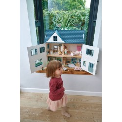 Kaunid trükitud vineerpõrandad ja sooneutraalsed värvid teevad sellest erakordse puidust nukumaja. Iseseisev kokkupanek.