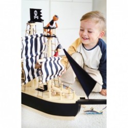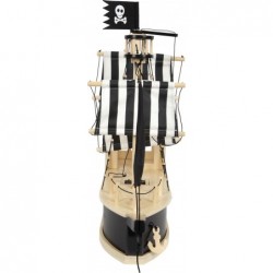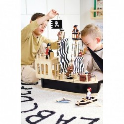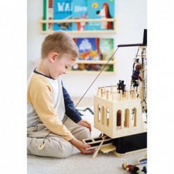 Ahoi, piraadid! See robustsest puidust valmistatud rikkalikult detailirohke piraadilaev teeb soovid teoks oma arvukate autentsete detailidega! Terviklikus mängukomplektis on lisaks mahukale kahest isandist koosnevale laevale ka kummipaat, millega saavad sõuda kaks painduvat nukku, hai, papagoi, aardelaegas, kahur, kaks tünni, plank ja muidugi lahe piraadilipp. Kõiki purjeid saab heisata ja trossidega välja tõmmata, nagu päris laeval. Kahur, mis tulistab oma kolme vildist kahurikuuli läbi õhu, lisab mänguajale lisalõbu! Suur piraadilaeva mängukomplekt sobib suurepäraselt fantaasiaküllaseks mängimiseks julgete meremeestena, kes uurivad merd, avastavad uusi maid ja lähevad aardejahile! Piraadilaeva sisemus pakub rohkelt panipaika kogu leitud aarde jaoks ning ka aardelaeka eriti väärtusliku saagi jaoks. Liikuv rool, trossvintsi külge kinnitatud ankur, köisredelid, kraana, tekil olev lõks ja kontk ahtris annavad kõik võimaluse realistlikuks mänguks. Ja see on praktiline: kui laev tuleks ruumisäästlikult ära panna, saab laeva rööpa ja mastid kergesti eemaldada. Sobib kuni 12 cm suurustele nukkudele � sobib ideaalselt väikese jalaga painutatud piraatnukkudele (12412).
