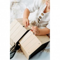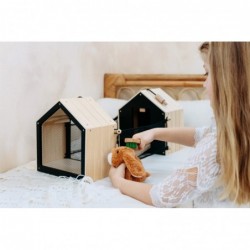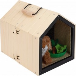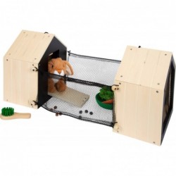 Küülikupuur plüüsistele pikk-kõrvadele! See stabiilsest puidust topeltkuur, mida saab kasutada ka transpordiks, koosneb kahest väikesest onnist, mida saab kuulide ja aasade abil ühendada. Ühes pooles saab topis jänes magada ja püsida segamatult tänu magnetiliselt sulguvale klappuksele, teisel pool aga läbi võrkümbrise ümbruskonnas ringi vaadata. Kahe võrkaeda saab ühendada puurkaedadega, et konta välispiirdeala. Sealhulgas plüüsist jänes, pintsel, väike taldrik, puust ja vildist porgandid, samuti salatitükk ja vildist küülikukaka tükid. Küülikupuurit saab kaasas kanda eraldatava keermestatud käepideme kaudu ja kaasa võtta kõikjale, kuhu soovite fantaasiaküllaseks rollimänguks liikvel olles! Välise aediku laiendamisega on kõik jänesepuuri alad lastele kergesti ligipääsetavad ja mängitavad. Tänu arvukatele tarvikutele on küülikuaedik kohe mänguvalmis ja pakub realistlikke rollimänge. Kui neil ei ole veel tõelist lemmiklooma, siis on see jänesepuuk ideaalne alternatiiv laste rollimänguks, kuna nad treenivad olulisi sotsiaalseid ja emotsionaalseid oskusi looma eest hoolitsemist teeseldes. Suur kogus naturaalset puitmaterjali koos kirjutatava tahvli pinnakatetega muudab selle küülikupuukoja lasteaias visuaalseks pilgupüüdjaks!