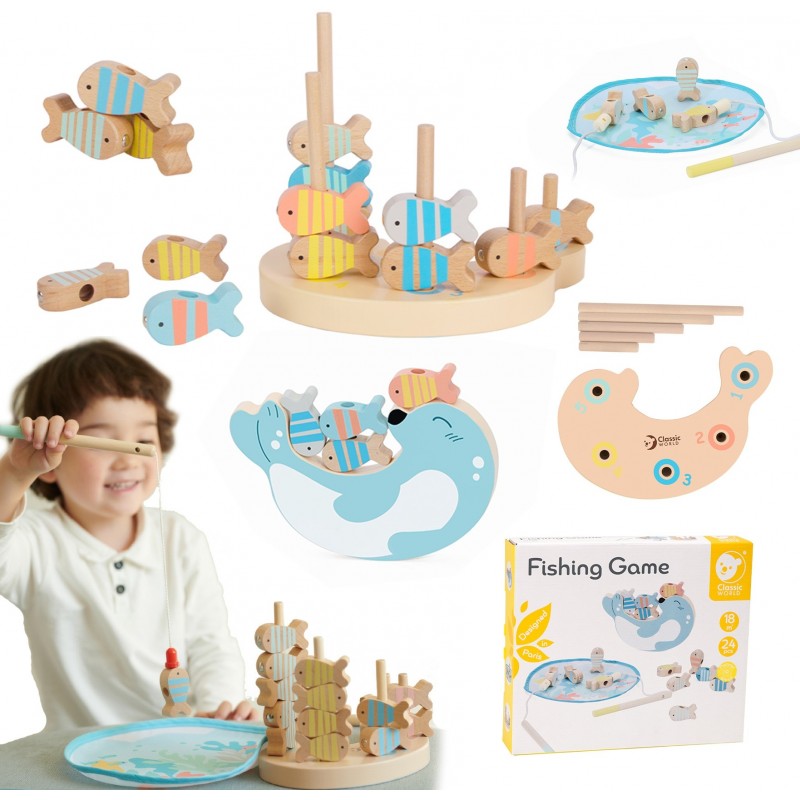Classic Worldi kalapüügikomplekt on enamat kui lihtsalt tavaline kalapüügimäng – see on kolm erinevat mängu ühes, pakkudes palju lõbu ja harivaid eeliseid! Saate püüda kalu, harjutada osavust ja sorteerida – valige oma lemmiktegevus või proovige neid kõiki. See multifunktsionaalne mänguasi sobib ideaalselt pere lõbutsemiseks, arendades reflekse, keskendumisvõimet ja osavust. Virnastatav laud sisaldab ka numbreid, nii et lapsed saavad lõbutsedes õppida numbreid ära tundma. Mänguasi on disainitud erksates värvides, mis kindlasti köidavad laste tähelepanu. Komplekt on valmistatud kvaliteetsetest materjalidest.