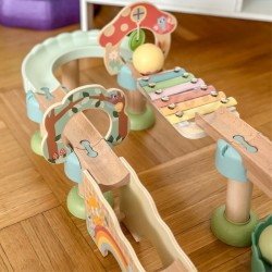 See kaunis puidust pallirada firmalt Woopie Green on ainulaadne mänguasi, mis ühendab liikumise, heli ja õppimise läbi mängu. See on ideaalne komplekt kõige pisematele maadeavastajatele, kes vaatavad rõõmuga värvilisi palle mööda rada veeremas, pannes erinevaid elemente liikuma ja tekitades meeldivaid helisid. Kogu komplektil on sõbralik pastelne värvilahendus, mis köidab pilku ja loob sooja ning rahuliku atmosfääri. Mänguasi avaldab muljet mitte ainult oma välimuse, vaid ennekõike funktsionaalsuse ja teostuskvaliteediga – see on loodud lapse arengut silmas pidades juba varasest east alates. Tänu mitmekesistele elementidele – nagu spiraalsed liumäed, sillad, rajad ja taldrikud – saavad lapsed jälgida pallide muutuvat liikumist, kuulata nende tekitatavaid helisid ning katsetada nende veeremise kiirust ja suunda. See on imeline mänguvorm, mis arendab ja pakub meelelahutust samaaegselt. See mänguasi sobib ideaalselt koju, eelkooli või stiilseks kingituseks väikelapsele või varases lapsepõlves.