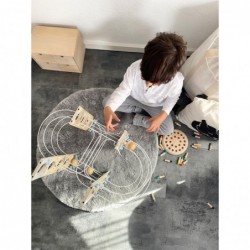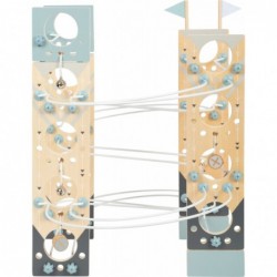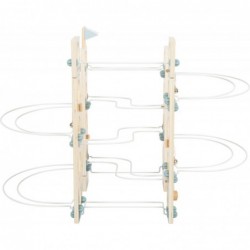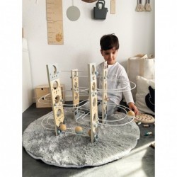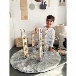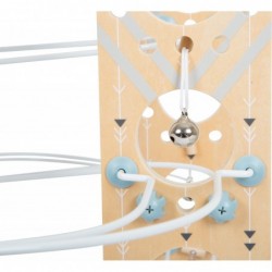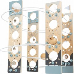Ehitusmänguasi ja marmorjooks ühes! See minimalistliku Skandinaavia disainiga moodulmarmorist tõmbab noori, edasipüüdlikke ehitajaid nagu võluväel! Tänu painduvale süsteemile, mis koosneb erinevatest metallpostidest ja spetsiaalsetest ühenduselementidest, pakub see marmorjooks rohkelt monteerimis- ja ehitusvõimalusi. Nelja suure täispuidust palli, korkide, kellukeste ja finišijoone lipuga on pikaajaline mängurõõm garanteeritud! Kaasas juhend koos kokkupaneku soovitustega. Modulaarne kokkupanemise põhimõte võimaldab konta uusi unikaalseid lugusid ning inspireerib katsetamis- ja fantaasiaküllast mängurõõmu. Peatajad ja väikesed kellad aitavad palle nende kiirel kurvides ja järskudel kaldteedel aeglustada, samal ajal kui valged ja sinised lipud tähistavad jooksu algust ja lõppu. Erinevate osade kokkupanemine treenib mänguliselt peenmotoorikat, samal ajal kui kellad pakuvad akustilist esiletõstmist. Oma peene disainiga, trendika suitsusinise ja rohke naturaalse töötlemata puiduga sobib see marmorist ratas suurepäraselt igasse elutuppa või lasteaeda! Ja see on eriti praktiline: pärast mänguaja lõppu saab marmorist käigukasti uuesti lahti võtta ja ruumisäästlikult hoiustada.