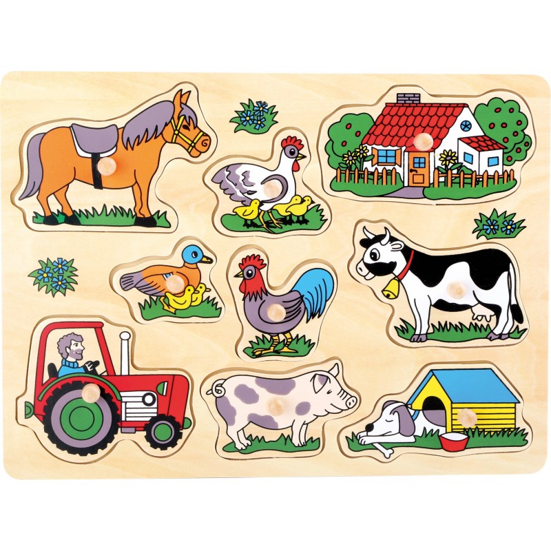 Selle pusle abil saate mängulise pilgu taluelusse heita. Puidust pusle sisaldab kokku üheksat tavaliselt talus leiduvat figuuri, mida saab puidust käepidemete abil hõlpsasti käsitseda. See treenib peenmotoorikat ja käe-silma koordinatsiooni. Pusletükid koosnevad hobusest, kanast, talumajast, pardist, kukest, lehmast, traktorist, sea ja koerakuutist.