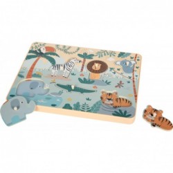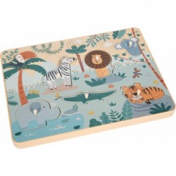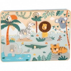 Akustiline õppimiskogemus noortele mõistatusfännidele! See armastavalt illustreeritud FSC� 100% sertifitseeritud puidust pusle toob lasteaeda safari põneva maailma, sealhulgas tõelisi loomahääli. Kui 7 üksikasjalikku pusletükki üles tõsta, kostavad vastavad loomahääled, mis muudavad silmad suureks ja kõrvad imestusest kerkivad. Motoorseid oskusi, keskendumist ning põhjuse ja tagajärje mõistmist soodustatakse lõbusal viisil. Puidust pusle avaldab muljet oma lapsesõbraliku disaini, värviliste motiivide ja põnevate heliefektidega. 7 looma – lõvi, tiiger, elevant, krokodill ja sebra – mahuvad täpselt ettenähtud väljalõigetesse ja teevad tõstmisel realistlikke loomahääli. Suured, kergesti haaratavad pusletükid sobivad ideaalselt väikeste laste kätele ning soodustavad nii käe-silma koordinatsiooni kui ka kannatlikkuse ja visaduse arengut mängides. Tänu kvaliteetsele töötlusele, kaasaegsele värvilahendusele ja kõrgele puidusisaldusele on pusle lasteaias õpetlik tipphetk.