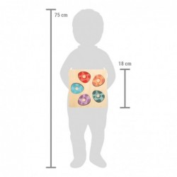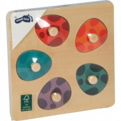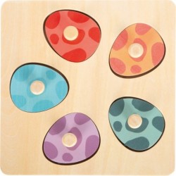Avasta, mängi ja õpi! See tugev FSC� 100% sertifitseeritud puidust dinosauruse pusle on mitmekülgne mänguasi, mis pakub topeltrõõmu: see pole ainult erksavärviline pusle, vaid ka põnev mälumäng. See armsalt kujundatud väikelastele mõeldud pusle koosneb 6 värvilisest dinosaurusemunade kujul olevast pusletükist, mis peidavad selle all vastavaid puidust dinosauruse kujusid. Armsad dinosaurused on eriline väike üllatus, mis toob mänguajale lisarõõmu. Pusletükkidel on praktilised puidust nupud, mis sobivad suurepäraselt väikeste laste kätesse. Puidust pusletükkide haaramine ja eellõigatud kujunditesse sättimine soodustab peenmotoorika arengut lõbusal moel. Lapsed õpivad keskendumisvõimet ja käe-silma koordinatsiooni treenides kannatlikkust ja vastupidavust. Mälumänguna on pusle ka lapsesõbralik mäng mälu treenimiseks, kuna mustrite äratundmine ja meeldejätmine avaldab positiivset mõju väikelaste kognitiivsele arengule.
